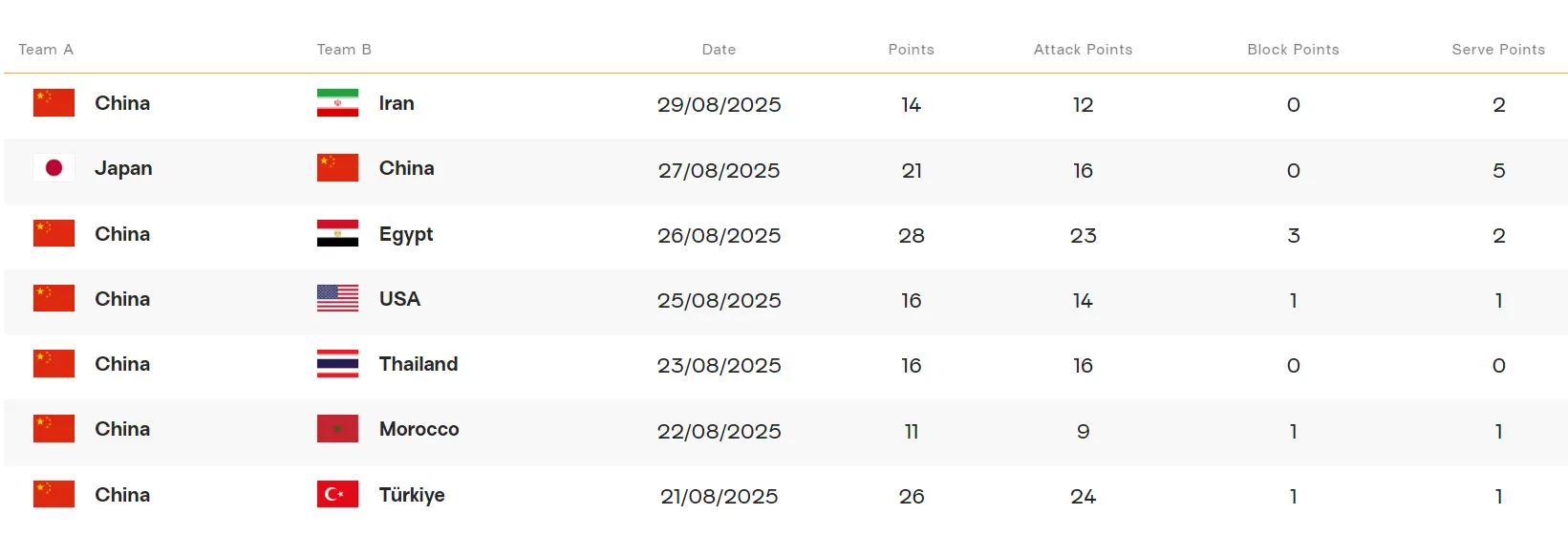 王泊涵15扣4中+1拦+6失误被拦,拿到5分,扣球成功率26.6%;史泰尔7扣1中+3失误被拦,拿1分,扣球成功率14.2%。